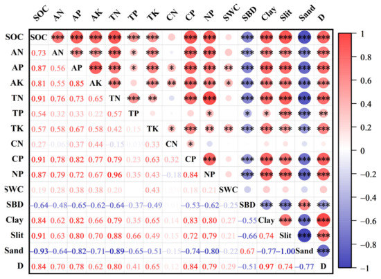 Pearson correlations between the soil properties. Soil property values for the 0–10 cm, 10–20 cm, and 20–30 cm soil layers in the figure. The numbers displayed represent correlation coefficients. Red indicates positive correlations between parameters, blue indicates negative correlations between parameters. The significance levels are * p < 0.05; ** p < 0.01; *** p < 0.001. Abbreviations: soil organic carbon (SOC), total phosphorus (TP), total potassium (TK), total nitrogen (TN), alkaline hydrolysis nitrogen (AN), available phosphorus (AP), available potassium (AK), carbon/nitrogen ratio (C/N), carbon/phosphorus ratio (C/P), nitrogen/phosphorus ratio (N/P), soil water content (SWC), soil bulk density (SBD), fractal dimension values (D values).