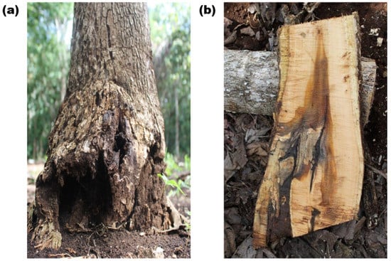 (a) Advanced symptoms of root and neck rot of teak, debarking with hyperplasia at stem base, can be observed; (b) teak stem cut longitudinally where the progress of the fungus from the base to upper part of the stem can be seen.
