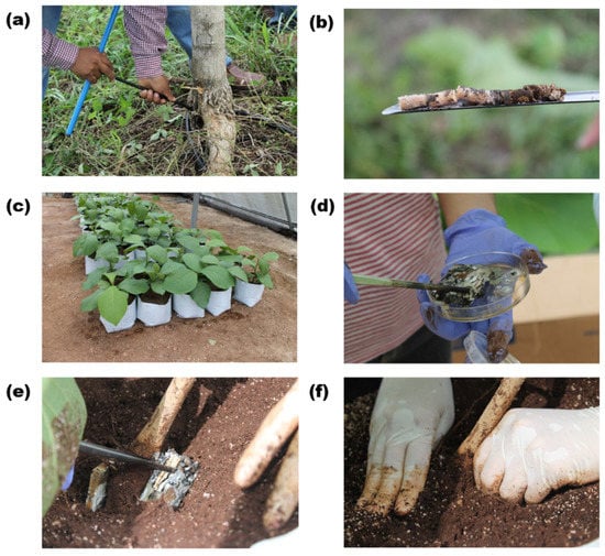 (a) Sampling tissue, in the field, from the base of the teak stem; (b) teak sample obtained both from the periphery and the vascular tissue; (c) three-month-old teak plants in greenhouse; (d) segment of teak tissue infected with krt-2 strain; (e,f) placement of the infected tissue segment in close contact with the base of the plant stem to be inoculated.