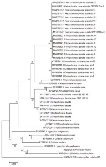The nineteen selected isolates were molecularly identified by nucleotide sequence analysis. The 5.8-ITS regions were amplified with the universal primers ITS1 and ITS4 []. PCR reactions were performed in reaction volumes of 25 µL containing: 50 ng of genomic DNA, 1X PCR buffer (10X: 200 mM Tris–HCl, 500 mM KCl, pH 8.4; Invitrogen, Carslbad, CA, USA), 0.20 mM of each dNTP (Invitrogen, Carslbad, CA, USA), 1.5 mM MgCl2 (Invitrogen, Carslbad, CA, USA), 1 µM of each primer, and 1.0 U Platinum Taq DNA polymerase (Invitrogen, Carslbad, CA, USA). DNA amplification was performed in a Thermal cycler 2720 (Applied Biosystems, Foster City, California, USA) and the program consisted of an initial denaturing step at 94 °C for 4 min, followed by 30 cycles of 1 min at 94 °C, 1 min at 58 °C and 1 min at 72 °C, and a final extension step of 7 min at 72 °C. PCR products were separated by electrophoresis in 1.5% (w/v) agarose (Invitrogen, Carslbad, CA, USA) gels and visualized by ethidium bromide staining. PCR products were purified and sequenced by Macrogen Inc. Korea. Alignment and edition were carried out with the BioEdit Sequence Alignment program [] and visually corrected. When trying to align the sequences obtained with those registered in the NCBI database, we found that there was no records at that time for the species K. zonata, so a phylogenetic tree was made with the sequences obtained and sequences of other Kretzschmaria species that have ITS region sequences recorded in this database, in order to identify all isolates from this work.