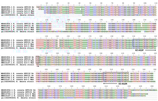 DNA in silico sequence comparison of the internal transcribed spacer (ITS) region between K. zonata from Mexico (MW015147.1, strain krt-1, and MW015744.1, strain krt-2) and from Brazil (MH481853.1, strain GFP131, and MH481854.1, strain GFP132) and K. deusta (EU162067.1, strain 910506.1). The location of the K. zonata species-specific primer set (KZ-AQ-3F and KZ-AQ-3R) sequences are delimited in boxes. In the nucleotide sequence by convention, the colors of the nucleotides are: green for adenine, red for thymine, blue for cytosine, and black for guanine.