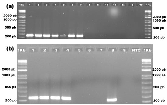 Specificity of PCR with the primer set KZ-AQ-3F/KZ-AQ-3R. (a) The 1 Kb lanes are for the DNA marker (1 Kb DNA ladder); positive bands at 241 bp; lane 1: krt-2 isolate; lane 2: krt-8 isolate; lane 3: krt-9 isolate; lane 4: infected teak tissue take from the field; lane 5: infected teak tissue take from the field; lane 6: infected teak tissue take from the field; lane 7: K. zonata krt-1 strain, positive control; lane 8: Fusarium solani; lane 9: Phytophthora sp.; lane 10: Fusarium equiseti; lane 11: Phellinus sp.; lane 12: Colletotrichum gloeosporioides; lane 13: Lasiodiplodia theobromae; lane NTC: non-template control. (b) The 1 Kb lanes are for the DNA marker (1 Kb DNA ladder); positive bands at 241 bp; lane 1: krt-3 isolate; lane 2: krt-8 isolate; lane 3: krt-9 isolate; lane 4: infected teak tissue take from the field; lane 5: Kretzschmaria deusta ATCC ® 38992; lane 6: Fusarium equiseti; lane 7: Lasiodiplodia theobromae; lane 8: K. zonata krt-1 strain, positive control; lane 9: Phellinus sp.; lane NTC: non-template control.