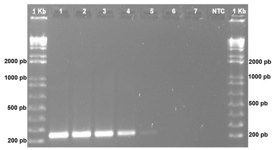 PCR sensitivity assay using the primer set KZ-AQ-3F/KZ-AQ-3R. The 1 Kb lanes are for the DNA marker (1 Kb DNA ladder); positive bands at 241 bp, lanes 1–7: amplified products using genomic DNA of the krt-1 strain at a concentration of: 20, 10, 0.1, 0.001, 1 × 10−5, 1 × 10−7 and 1 × 10−8 ng/µL, respectively; lane NTC: non-template control.