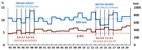The amount of precipitation and air temperature (annual and average for the period from 1993 to 2020) calculated based on data from weather stations (“Toropets”, “Velikiye Luki” and “Smolensk” [65]) are presented in Figure 2.