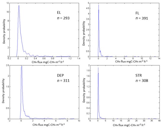 An analysis of the probability density distribution of CH4 fluxes (mgC m−2 h−1) obtained in the summer–autumn periods of 1995–1998 and 2013–2016 for 4 sites (EL, FL, DEP, STR) is presented in Figure 3.
