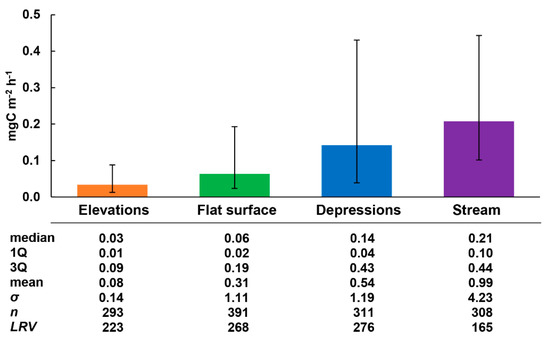 The results of statistical generalization of all obtained methane fluxes for 4 sites are shown in Figure 4. According to the Kruskal–Wallace test (total n = 1172, p < 0.01), medians of fluxes differ significantly for relief elements (sites). The smallest fluxes (1Q-median-3Q, mgC m−2 h−1) are typical for elevations (0.01–0.03–0.09; EL), somewhat larger for a flat surface (0.02–0.06–0.19; FL), and the largest for depressions (0.04–0.14–0.43; DEP) and water surfaces (0.10–0.21–0.44; STR).