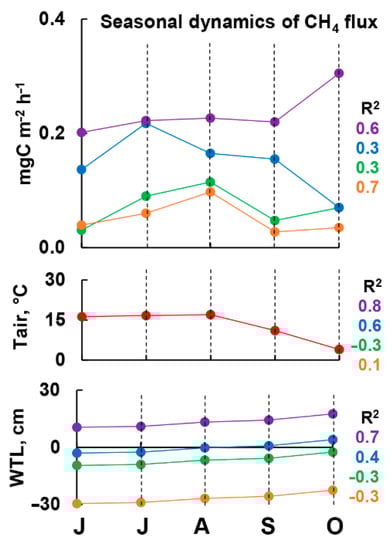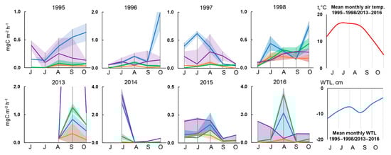 The same dynamics were typical for the EL, FL, and DEP sites in 2015. At the STR site (Figure 5, purple), the dynamics were rather the opposite: in 1995–1997, 2014, and 2016, there was a decrease in the magnitude of methane fluxes from June to July (1995, 1997) or from July to August (1996, 2014 and 2016), followed by an increase by August or September (a “bowl” pattern). At the DEP sites, the character of seasonal dynamics in some cases had the “bell” pattern (1997, 2013, 2016), in others—the “bowl” pattern (2014). In 1995, 1996 and 1998, methane fluxes at the DEP sites were almost constantly growing from June to October, with a slight decrease in September.
