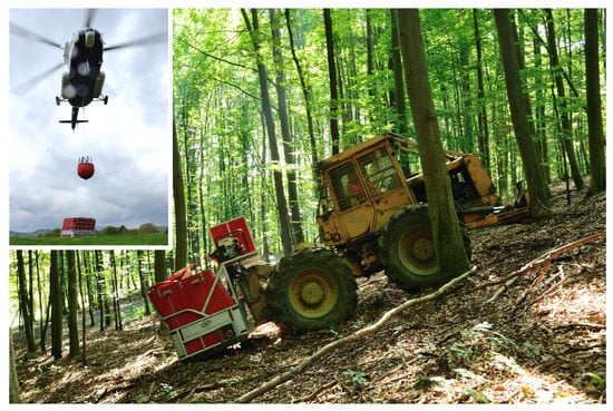 - Hnilica, R.; Messingerová, V.; Stanovský, M.; Slugeň, J.; Hnilicová, M.; Ferenčík, M. Possibilities of Mechanization of Works on Forest Establishment and Timber Stand Improvement/Možnosti Mechanizácie Prác pri Zakladaní a Výchove Lesa; Monograph; Technical University in Zvolen: Zvolen, Slovak Republic, 2015; p. 99. [Google Scholar]