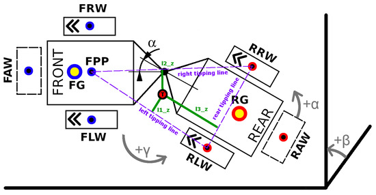 Equation (2) needs to know position T of the gravity vector (Figure 3). It is computed from weights and gravity vectors positions of the front and rear frames of the skidder (FG, RG, see Figure 3) and mount points for additional weights/loads (FAW, RAW, see Figure 3). All the gravity vectors create a list. The procedure for getting the final gravity vector position T is as follows: