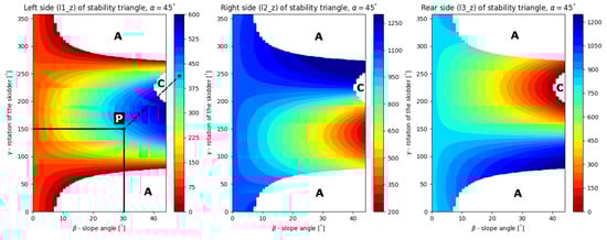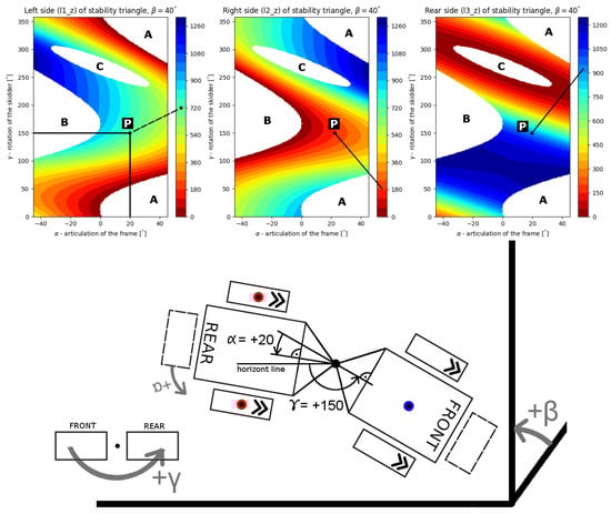 How to read the plots. Input parameters: —articulation of frame, —rotation of skidder, —slope angle (constant value). P—a combination of input parameters, A—area of instability, due to the left side (tipping line) of stability triangle, B—area of instability, due to right side of stability triangle, C—area of instability, due to the rear side of stability triangle. The first and second images display lateral stability, and the last one stands for longitudinal stability. Color bars show the distance of the gravity vector (for the whole machine, including additional loads) to tipping lines in [mm].