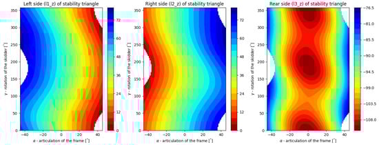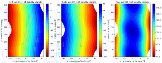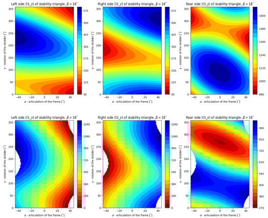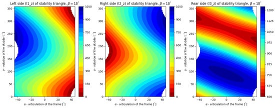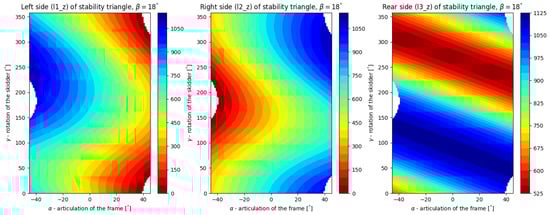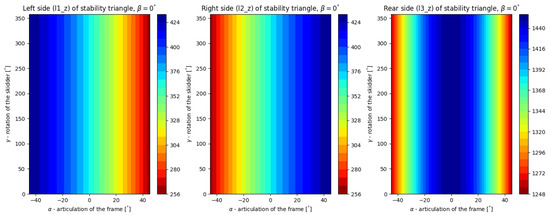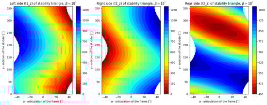 The unloaded skidder is stable in the range of the intervals above (the plots contain no white areas). This is, however, not valid for the skidder with the full water tank. It is unstable if frame articulation is higher than and rotation of the skidder is around (left white area), or is zero and is more than (right white areas). These positions on the slope represent the front half-frame on a contour line and the rear half-frame placed higher in the articulated positions. If the color bar’s ranges for the left and right sides of the stability triangle are compared, the result is that the stability for the device equipped with the full water tank is higher, but within the limit above. It is an effect of the changed position of the center of gravity (CG), due to the heavy tank. The CG is moved toward the rear axle, and the distance between CG (point T, Figure 3) and FPP (Figure 3) points is higher, which results in higher distances of l1_z and l2_z, as shown in Figure 7. The comparison of color bars for the rear side of the stability triangle shows substantially decreased stability of the device equipped with the tank.