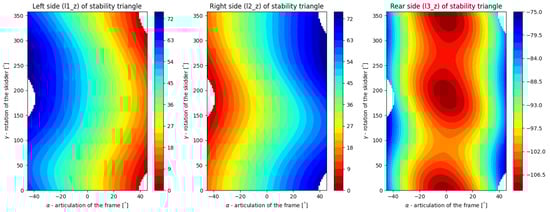 The first mode can evaluate the static stability of a firefighting device configuration on a predefined slope, considering maneuvers, i.e., rotations/positions on the slope. Thus, it is possible to evaluate an influence of a combination of a frame articulation and rotation of a firefighting device configuration on stability, as a distance of a gravity vector to a tipping line. In general, wheeled skidders should not operate on slopes that exceed . It is, of course, a function of load size. For a skidder with a 3-tonne load, it is between (downhill) and , a skidder with a 4-tonne load between and and skidder with 5-tonne load between and [23]. The maximum load size of the firefighting adapter is 3188 kg. Considering the position of the water tank the angle of () has been used. This angle was used for the analyses in the first mode, where a slope angle is a constant. The second mode allows to set up a constant angle of articulation of a frame and investigates its influence on stability if needed. Or it allows determining a maximal slope angle for a given combination of input parameters. Both the modes, require two variable input parameters, and provide three outputs, as shown in Figure 4 (1st mode) and Figure 5 (2nd mode). A Python matplotlib.pyplot library had been used to display results for both the modes using a contourf plot.