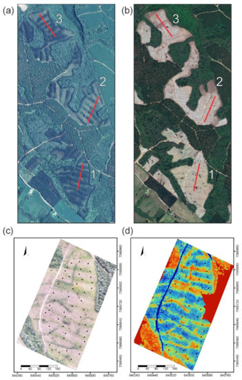 Satellite image of three sites on 8 February 2014 before eucalyptus harvest (a); satellite image of Pinus taeda on 5 December 2016 after paper-residue application (b); DRONE (c) and NDVI (d) imagery of the third site at sampling on 1 April 2018. 1;2;3—Transect lines are shown in red (a,b).