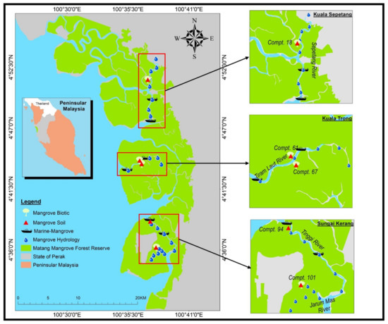 This study was conducted in the Matang Mangrove Forest Reserve (MMFR). The MMFR is located in the Northern region of Peninsular Malaysia; it lies from the latitudes 4°32′10.81″ N to 4°56′03.54″ N, and from longitudes 100°28′33.26″ E to 100°37′40.54″ E; stretches from Kuala Gula in the north to Bagan Panchor in the south. The MMFR is the largest mangrove forest in Peninsular Malaysia, with a total area of 40,288 ha [49]. This forest consists of 19 patches, which are segmented by numerous large and small rivers; they are joined with the coastal areas of the Malacca Straits in the West, with a total of 108 compartments. The Matang mangroves are divided into four management zones, namely (1) Kuala Sepetang North, (2) Kuala Sepetang South, (3) Kuala Trong, and (4) Sungai Kerang (Figure 1).