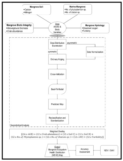 To identify the parameters that influence mangrove ecosystem health, we used different datasets from Faridah-Hanum et al. [1]. These data have been measured and sampled from 2015 to 2016. In their study, eight variables (aboveground biomass (AGB), abundance of crab, soil nitrogen (N), soil carbon (C), number of phytoplankton species, number of diatom species, dissolved oxygen (DO) and turbidity) were chosen from 43 variables via principal component analysis (PCA). Later, all 8 variables were integrated and analysed using ArcGIS software version 10.3 for geostatistical analysis. Consequently, we interpolated all the variables obtained from all the sampling points to represent the status of mangrove health in the MMFR. A linear weight combination was used to show the distribution map. For validation, we used the vegetation status derived from the vegetation indices analysis conducted by Rhyma et al. [13]. Figure 2 shows the workflow of the methodology performed in this study.