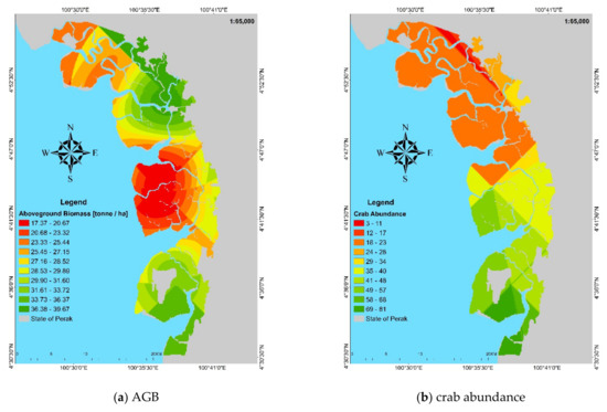 Vegetation distribution exerts a significant influence on crab abundance. Lindquist et al. [70] described crabs prefer seeds, propagules, fruits, seedlings and leaf litter as their sources of food. Cannicci et al. [71] suggested that the spatial prediction autocorrelation of mangrove crabs is commonly associated with tree zonation and abiotic factors such as ground temperature and soil granulometry. Our predicted results indicate an excellent quality of crab abundance (MQISi > 1:5) in some parts of Sungai Kerang, with 59–81 crabs observed; the worst quality of crab abundance (MQISi < −1.5) mostly occurs in the seaward regions of Kuala Trong stretching towards Kuala Sepetang, with 3–23 crabs observed as Figure 3b. By observing the values in the NDVI and SAVI maps [13], VJR and land with matured mangrove trees (mostly aged more than 20 years) are identified as areas of excellent crab abundance. Within this physical environment, there are rich food sources for the crabs. In addition, there is no disturbance from tree thinning activities go; this is a primary reason Sungai Kerang has excellent crab abundance compared with the other regions. Kuala Sepetang was reported by Perak State Forestry Department as a production forest; thus, there are lots of disturbances from human activities related to timber harvesting operations, and this factor coupled with the upstream anthropogenic activities may have reduced the abundance of crabs [5].