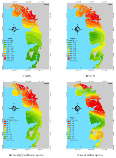Prediction performances were assessed by cross-validation, which examined the accuracy of the estimated distribution map. Additionally, the spatial autocorrelation of the measured sample points was examined based on the ratio between the nugget and sill. The nugget effect can be attributed to measurement errors or spatial sources of variation at distances smaller than the sampling interval or both [52]. Bhunia et al. [39] suggested that the ratio values of <0.25, 0.25–0.75 and > 0.75 show strong, moderate and weak spatial autocorrelation, respectively. Although three variables of our study are characterised by moderate (soil C and turbidity) and weak (number of phytoplankton spp.) autocorrelation, which indicates that the locations of sampling points are farther apart, our future work will encompass the scales of spatial variation in data collection. However, in this study, we proceed to estimate mangrove ecosystem health with the existing original data. The methodology and steps of geostatistical analysis undertaken in this study will be useful for our future work in estimating mangrove ecosystem health with good accuracy by understanding the spatial variation in sample points [39].