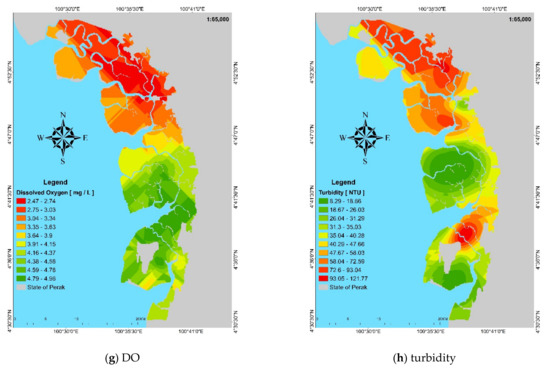 The availability of aquatic organisms is influenced by conditions of water quality [84,85]. The DO as presented in Figure 3g is predicted to have a pattern similar to that of phytoplankton and diatom, except in the middle part of Kuala Sepetang. However, the spatial prediction autocorrelation of turbidity is slightly different for DO in the upper part of Sungai Kerang (right at the bottom of Kuala Trong), which is predicted to have high turbidity as Figure 3h. Using the Rational Quadratic semivariogram model, the original data were used in predicting turbidity for the entire MMFR; the overall prediction accuracy is low compared with other variables—ME: 1.1194; RMSE: 12.6746; RMSSE: 0.7975 [38,39,40]. This might be the reason for the different trend of turbidity as compared with DO [86].