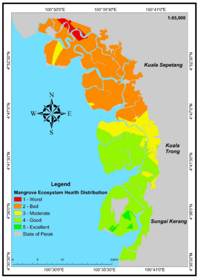 In this study, mangrove ecosystem health is assessed using the MQI. The MQI was developed by Faridah-Hanum et al. [1] to determine a baseline of mangrove ecosystem health which took into consideration the mangrove forest, contributing components of a mangrove forest, soil, surrounding marine ecosystem, and hydrology variables. They found three of five types of health classes for three regions of the MMFR are MQI 2 (bad) for Kuala Sepetang, MQI 5 (excellent) for Kuala Trong and MQI 4 (good) for Sungai Kerang. However, their findings were based on selected and accessible sampling locations. With the geostatistical analysis, their findings could be utilised to predict health classes for unsampling locations with distribution areas. As a validation method, the NDVI was used by Faridah-Hanum and colleagues [1].