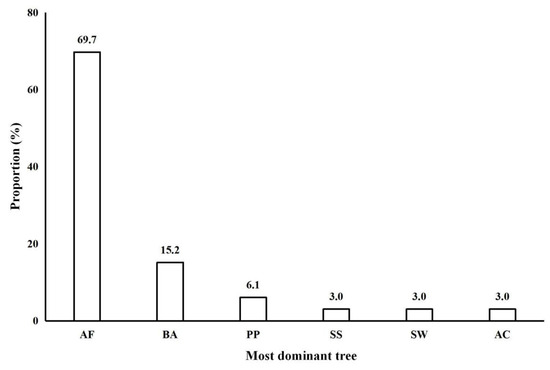A total of 33 AF plots were surveyed in the field; 69.7% (23 of 33 plots) of them were dominated by AF, 15.2% (5 of 33 plots) were dominated by Betula albosinensis, and 6.1% (2 of 33 plots) were dominated by Picea purpurea. The remaining proportion was shared by other species, such as Sabina saltuaria, Salix wallichiana, and Acer caudatum (Figure 2).