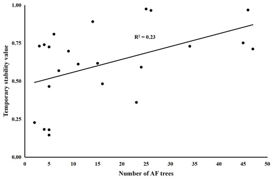 Linear regression model between temporary stability (dependent variable) and the number of Abies faxoniana (AF) trees (independent variable).