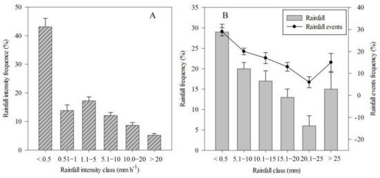 The distributions of the rainfall intensity, rainfall, and rainfall events from 1 May to 30 September 2014–2018. (A), the frequency of different rainfall intensity classes; (B), the frequency of rainfall events and rainfall in different rainfall classes.