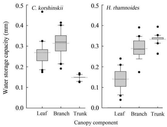 Box-and-whisker diagrams of the water storage capacity of leaf, branch, and trunk for C. korshinskii and H. rhamnoides, showing the mean value (the dotted line), standard deviation, and 25th, 50th, 75th, and abnormal percentile values.