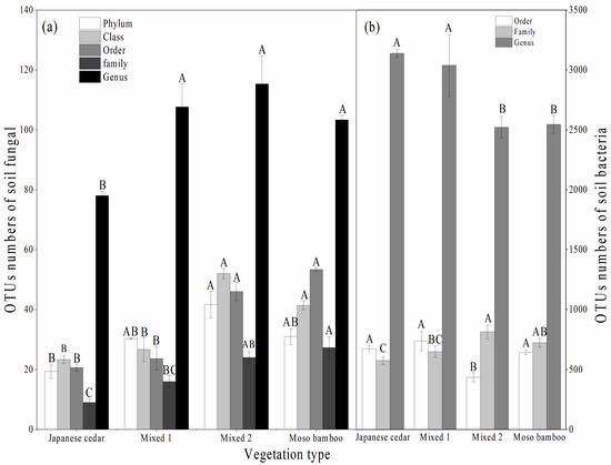 The results of the high-throughput sequencing showed that there were significant differences in the number of soil bacterial OTUs in the four vegetation types at the order, family, and genus levels, but no significant differences at the phylum and class levels (Table 3, Figure 1). At the order level, Japanese cedar, mixed 1, and moso bamboo possessed significantly more OTUs than mixed 2. At the family level, moso bamboo and mixed 2 were significantly higher than Japanese cedar. At the genus level, Japanese cedar and mixed 1 were significantly higher than moso bamboo and mixed 2.