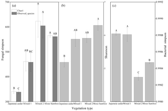Effect of different vegetation types on soil fungal and bacterial α-diversity index (means ± se). (a) Fungal a diversity Chao1 and observed species index, (b) fungal a diversity Shannon index, (c) bacterial a diversity Simpson index. Different letters above columns in the same color indicate significantly different.