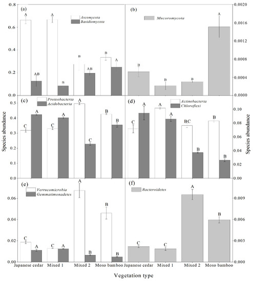Effect of different vegetation types on species abundance of soil fungal and bacterial at the phylum level (means ± se). (a) Fungal species Ascomycota and Asidiomycota, (b) fungal species Mucoromycota, (c) bacterial species Proteobacteria and Acidobacteria, (d) bacterial species Actinobacteria and Chloroflexi, (e) bacterial species Verrucomicrobia and Gemmatimonadetes, (f) bacterial species Bacteroidetes. Different letters above columns in the same color indicate significantly different.