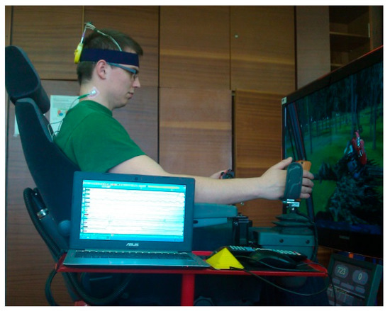 An operator’s physiological response (biofeedback) to workload was expressed as the change in their heart rates while operating the harvester simulator. The heart rate of the participants was measured simultaneously with the measurements of factors of the work environment by the MULTI module of the Biofeedback 2000 x-pert device (photopletysmograph), which was positioned on the temporal region of the participants‘ head. The device recorded the heart rate at a rate of 100 Hz. The heart rate measurements were divided into two steps for each participant: workload measurements and rest phase measurements. The workload measurements lasted for approximately 30 min. After the heart rate measurements started, participants started operating the harvester simulator; then, after 30 min, the heart rate recording was stopped and the participants stopped working with the simulator. After the workload measurements, the rest phase (control) measurements were conducted. The rest phase measurements lasted for approximately five minutes. After the work with the simulator ended, the participants were seated in an ergonomic armchair and rested, with minimal muscle movements. In some cases, they were silent. If that was uncomfortable for the participants, they held a calm conversation with the researcher. The purpose of these measurements was to establish a baseline heart rate for that particular day. A detailed description of the data gathering and processing method was described by [14,25].