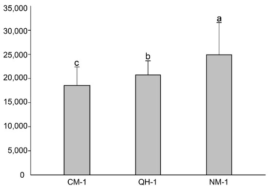 The mean numbers of reproducing nematodes from the different isolates of B. cinerea are shown in Figure 1. The average numbers of CM-1, QH-1, and NM-1 on the fungal mats were 18,559, 20,706, and 24,870, respectively. The mean number of NM-1 B. xylophilus isolates was significantly larger than that of CM-1 and QH-1 (p < 0.01).