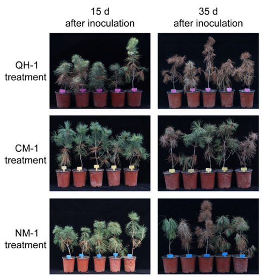 This study showed that the three investigated isolates of B. xylophilus had varying rates of pathogenic effects on P. koraiensis seedlings. The virulence of QH-1 was significantly different from the other isolates. The results from the pathology tests showed that wilting symptoms began after 10 days and lasted up to 35 days in the inoculated seedlings, while the seedlings inoculated with QH-1 had the most rapid disease progression. These results are similar to those of a previous study on the infection of other pine seedlings with B. xylophilus [31,32,33]. The highly pathogenic PWN isolate caused the rapid onset and progression of disease in the inoculated seedlings.
