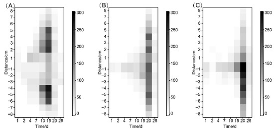Distribution of B. xylophilus in 4-year-old P. koraiensis seedlings after inoculation (25 days). The shade of the square represents the number of nematodes in the different segments; a darker color corresponds to a higher number. The Y axis represents the distance between the inoculation point (1.5 cm) and sampling point. (A) Distribution of QH-1 in inoculated seedlings. (B) Distribution of NM-1 in inoculated seedlings. (C) Distribution of CM-1 in inoculated seedlings.