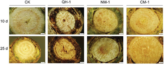 The internal symptoms of inoculated trees were observable using an optical microscope (Olympus, Japan). At 10 days after inoculation, the stem segments of the trees treated with sterile water (CK, CM-1, and NM-1) were healthy (Figure 5); however, half of the pith tissue and phloem was necrotic and had turned brown in the trees inoculated with QH-1. Moreover, the phloem and pith tissue were completely necrotic and brown in the trees inoculated with QH-1, while the stem segments of the CK-, CM-1-, and NM-1-treated trees were symptomless.
