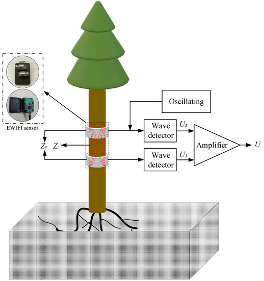 Tree stem is mainly composed of water and wood. The dielectric constant of water is approximately 81 and the dielectric constant of wood is approximately 3 [13,14]; thus, the dielectric constant of tree stems changes with the varying water content in them [15]. When the probe is installed at the stem, a change in the dielectric constant of the stem leads to a change in the probe impedance. As shown in Figure 1, when the electromagnetic wave generated by the oscillating source is transmitted to the probe along the transmission line, the impedance of the plant tissue inside the probe does not match the impedance of the probe, and the electromagnetic wave is reflected from the inner edge of the probe [16,17,18]. The impedance of the probe can be estimated by measuring the incident and reflected waves of the probe. Therefore, we designed an EWIFI sensor to measure StWC. The sensor mainly includes a 100 MHz electromagnetic wave oscillation signal source, a 50 Ω coaxial transmission line, a bimetallic ring probe, two signal wave detectors, and a signal amplifier. The sensor output voltage (U) can be computed using Equation (1) as follows: