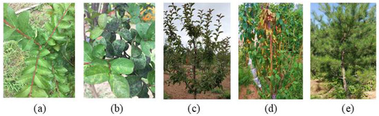 (a) Lagerstroemia indica L. growing healthily; (b) Lagerstroemia indica L. artificially infested with pests in July 2019; the lesion area on the trunk or leaves was more than 50%; (c) Malus micromalus Makino under normal watering conditions.; (d) Malus micromalus Makino under drought stress (26 June 2019); (e) Pinus tabuliformis Carriere.