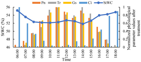 Figure 3 shows that Pn, Tr, and Gs were significantly negatively correlated with StWC, and Ci was significantly positively correlated with StWC. The correlation between StWC and physiological parameters can be clearly explained in terms of plant physiology. This shows that Pn accelerates with the increase in light intensity in the morning, and the rapid production of organic matter in plants increases the demand for water and carbon dioxide, reducing Ci, The increase in Gs leads to an increase in Tr, improving the water transport efficiency [21,22], the stem tissue transports part of the water to the leaves through ducts, which leads to a decrease in StWC. However, the plants take a short siesta at noon; Pn, Tr, and Gs decrease; Ci increases; leaf water demand decreases; and StWC increases slightly. The close correlation between StWC and plant physiological parameters (Pn, Tr, Gs, and Ci) indicates that StWC can effectively reflect information on the vital activity status of plants [32,33].