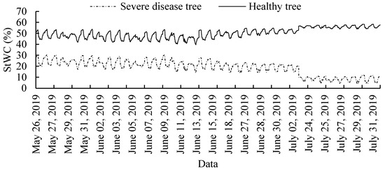 The decrease in StWC and the increase in StWC fluctuations (Figure 4, Figure 6 and Figure 7) indicate that the distribution and transport of water in the stem is disrupted and the stem’s ability to store and transport water is reduced [37], at a time when we know that the tree is suffering from pest and disease infestation. Under conditions such as plant senescence and pest and disease infestation, plant vigor decreases and normal metabolism is disturbed. A series of changes and disruptions in physiological functions and structural tissues occur, usually manifested by symptoms such as discoloration and wilting of leaves, and the tilting and embolism of stems and branches [38,39,40]. This conclusion is consistent with our finding that compared to unhealthy tress, healthy trees have better water regulation which leads to a smaller diurnal range of StWC. Therefore, StWC can be used to determine whether plants suffer from pests and diseases and further assess their vitality, which may have important practical implications for plant pest and disease control.