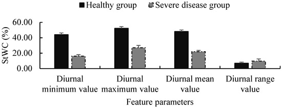 The changes in StWC of Lagerstroemia indica L. under different health conditions are depicted in Figure 4. In the long term, the diurnal mean StWC of healthy trees first decreased and then increased. However, the diurnal mean StWC of severely diseased trees decreased all the time. For a better understanding of the effects of weakened plant vitality owing to diseases on StWC, we further analyzed the diurnal variation rule of StWC under disease stress. The diurnal minimum, maximum, mean, and range of StWC were selected as feature parameters to represent the diurnal variation rule of StWC. The means and standard deviations of the four feature parameters measured on June 1 among the different health level groups are shown in Figure 5. The diurnal minimum, maximum, and mean of StWC showed a positive correlation with the group health levels, and the diurnal range of StWC showed a negative correlation with the group health levels. Furthermore, the effects of disease on the four feature parameters were tested using one-way analysis of variance. As Table 5 shows, the four feature parameters differed significantly (p < 0.001) among different health level groups, indicating that tree health status can be diagnosed by analyzing the four feature parameters. The effects of disease on StWC also can be interpreted based on plant physiology. The lesions caused by diseases can induce tylosis formation, which reduces hydraulic conductivity, xylem function [23], and water transport [24] in affected stems and weakens the plant vitality, ultimately resulting in a decrease in diurnal mean StWC and an increase in the diurnal range of StWC.