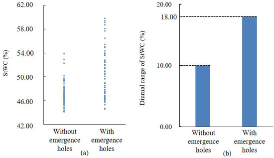 The first experimental group of Pinus sylvestris var. mongholica Litv. (a) StWC of trees without and with emergence holes. (b) Diurnal range of StWC.