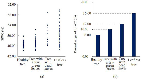 The second experimental group of Pinus sylvestris var. mongholica Litv. (a) StWC of trees in four different health conditions. (b) Diurnal range of StWC for trees in four different health conditions.