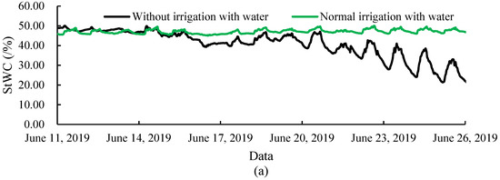 The StWC of Malus micromalus Makino under normal irrigation and without irrigation in Figure 8 showed significant variability, indicating that StWC can effectively characterize abnormalities in plant vital status, and the fluctuation of StWC in the form of diurnal variation also proves that the tree stem has the function of water storage and self-regulation [11,41,42]. The diurnal range and diurnal mean of StWC for Malus micromalus Makino under normal irrigation and without irrigation which indicate that the plant is in dynamic equilibrium in a healthy state and will self-regulate to maintain its dynamic stability [43,44]. Moreover, plant in a healthy state also have certain resistance to stress. The diurnal range of StWC for Malus micromalus Makino under normal irrigation and without irrigation before 15 June in Figure 8b were within 4%, and the diurnal mean of StWC fluctuated around 47% (Figure 8c), respectively, which clearly support this conclusion. When the stress suffered by the plant persisted with entering into a sub-healthy state, and in order to resist this sub-healthy state, the plant gradually slowed down and shut down the related vital activities and reduced water consumption, it also still had some regulation ability to itself, so the diurnal range and diurnal mean of StWC in Figure 8b,c showed a trend of slow fluctuation after 15 June. As drought stress continues, the water deficit in the plant will lead to the death of a large number of cells in the plant, at which point the plant becomes less vigorous and begins to lose its ability to regulate itself [45]; the irreversible decline of stem moisture at 20 June in Figure 8 also proves the point of attention that the plant is in an irreversible dying state at this time. To ensure the health of the plant, irrigation should be started as soon as the diurnal range and diurnal mean of StWC fluctuate more than normal. Hence, StWC can be used to set irrigation thresholds and provide technical support for precision water-saving irrigation.