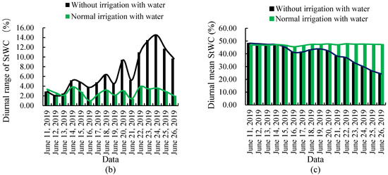 StWC changes in normal irrigation with water and without irrigation with water: (a) StWC of Malus micromalus Makino. (b) Diurnal range of StWC for Malus micromalus Makino. (c) Diurnal mean of StWC for Malus micromalus Makino.