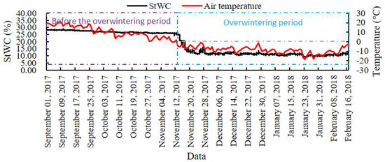 Figure 9 shows changes in StWC of Pinus tabuliformis Carriere before and after entering the overwintering period. Before the overwintering period, the ambient temperature was above 0 °C and the StWC fluctuated steadily at about 27%. The vitality of Pinus tabuliformis Carriere declines when StWC begins to decline rapidly until the plant goes dormant for overwintering, at which point stem moisture remains at a low level of about 10%.