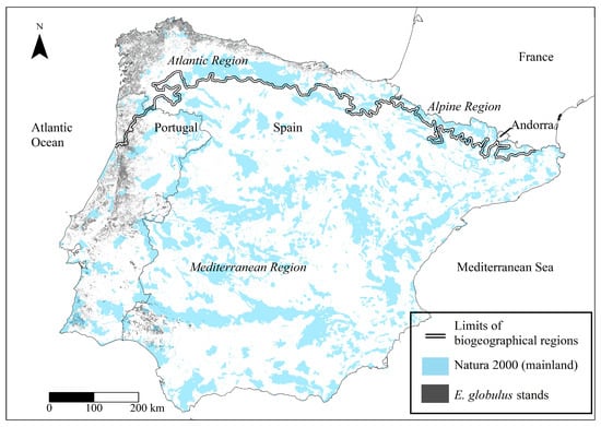 Eucalypts globulus Labill. distribution, biogeographical regions (italic text) and terrestrial protected area from the Natura 2000 network in the Iberian Peninsula (Portugal and Spain).