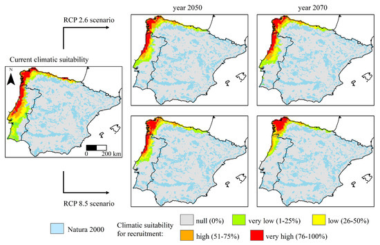 Under both climate change scenarios (RCP2.6; RCP8.5), projections show a northward contraction of the recruitment range, more pronounced under the worst scenario (RCP8.5), decreasing to nearly half of the current range in 2070 (83,275 km2 to 42,700 km2) (Table 3). In both scenarios, the recruitment potential becomes zero in south Portugal. Areas showing the best recruitment conditions (≥51%) become progressively confined into the northwest (Figure 2), even though new suitable areas emerge in northwest Iberia towards inland, especially under RCP8.5. Maps showing gain–loss range dynamics are available in Supplementary Material (Figure S2).
