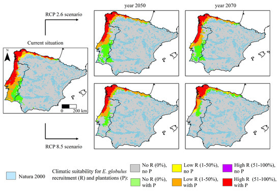 The SDMs were projected for future conditions according to two contrasting RCPs (Representative Concentration Pathways) 2.6 and 8.5, for the years 2050 and 2070 in order to be comparable with a previous work [4]. The suitability for E. globulus recruitment was reclassified and presented into five probability classes: 0% (no recruitment suitability); >0 ≤25% (very low); >25 ≤50% (low); >50 ≤75% (high); >75–100% (very high).