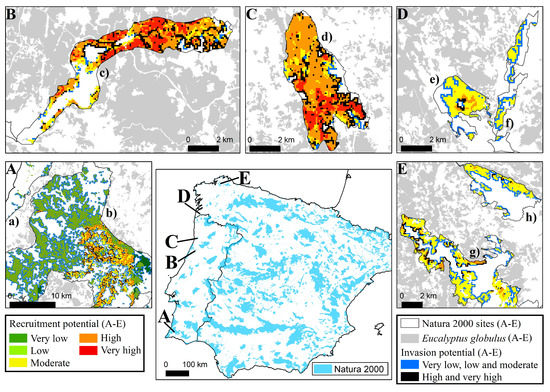 Terrestrial Natura 2000 in the Iberian Peninsula (central frame) and recruitment potential and invasion potential of Eucalyptus globulus inside some Natura 2000 sites (frames (A–E)). Sites include: (a) Costa Sudoeste (PTCON0012 and PTZPE0015); (b) Monchique (PTCON0037); (c) Rio Vouga (PTCON0026); (d) Valongo (PTCON0024); (e) Monte Aloia (ES1140005); (f) Gándaras de Budiño (ES1140011); (g) Fragas do Eume (ES1110003); (h) Xubia-Castro (ES1110013).