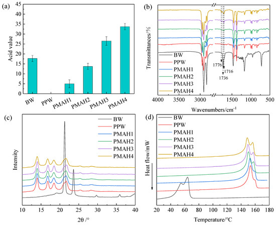 As shown in Figure 1b, the infrared spectra of BW, PPW, and PMAH were achieved. The peak at 1736 cm−1 for beeswax represented ester carbonyl functional groups, while 2916 cm−1 and 2848 cm−1 reflected fatty acid chains [35]. Compared with PPW, new peaks at the wavelengths of 1776 cm−1 and 1716 cm−1 in PMAH reflect C=O vibrations of the cyclic anhydride ring and C=O of the carboxyl group [36]. Thus, MAH groups have been successfully grafted on PPW. The former peaks of PMAH are more shaped as the acid value increase.